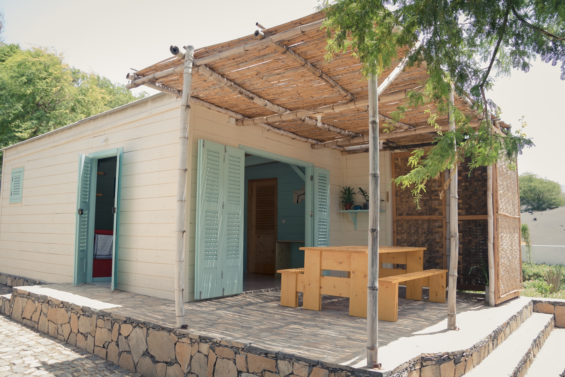 Petit gîte vert et blanc décoré avec des peintures réalisées par des artistes locaux illustrant le travail de la canne à sucre et la fabrication du grogue (Rhum blanc local).